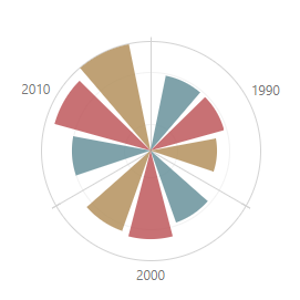 You can specify individual series' angular bar width. In multi-series charts, different series' bars with the same argument are collected in groups with a customizable angular width. You can use fixed (that is, degrees) or relative units to set both these widths. Use relative units if the width should adapt to the UI component or container size. Fixed width takes precedence over relative width if both are specified.